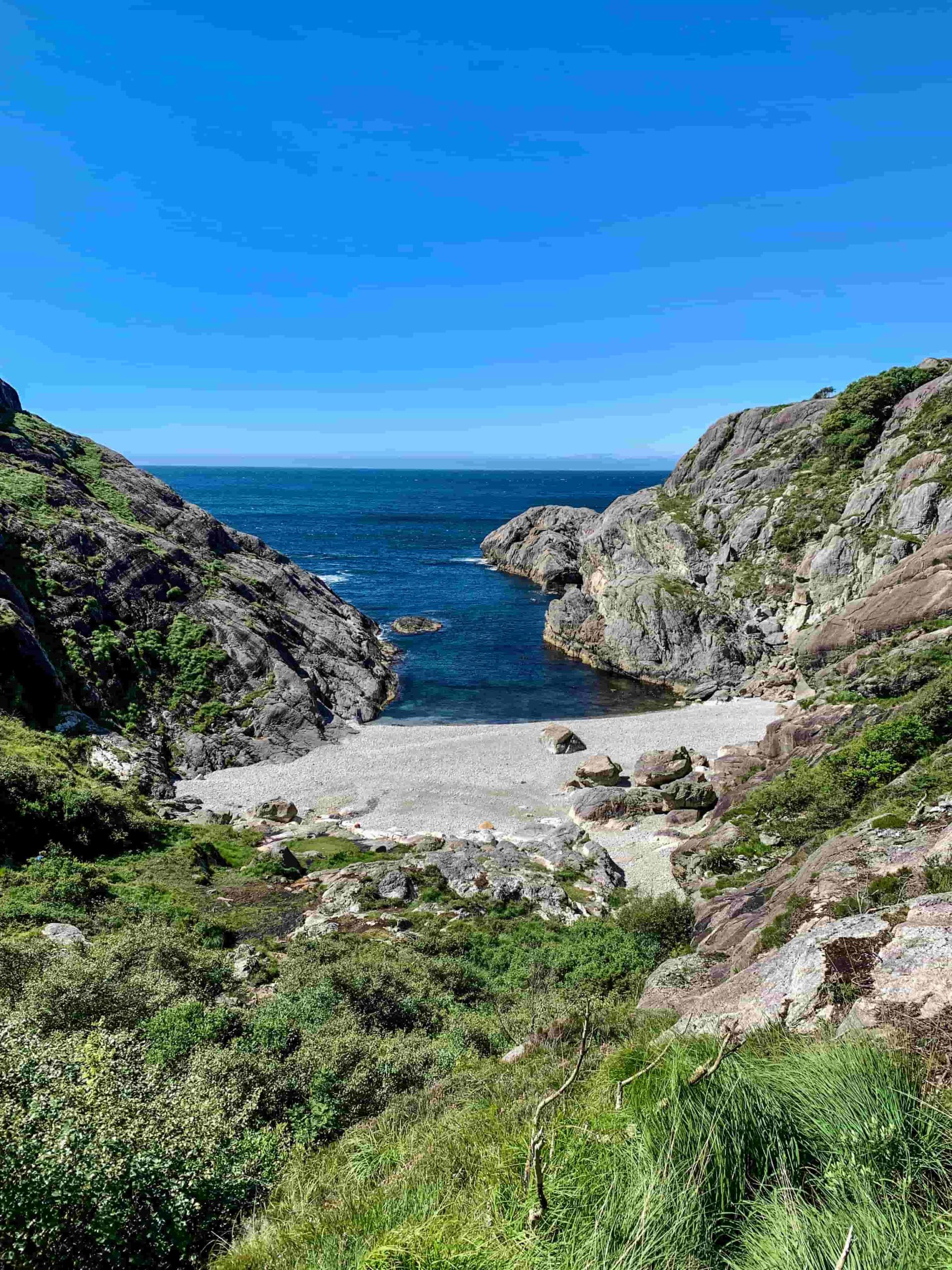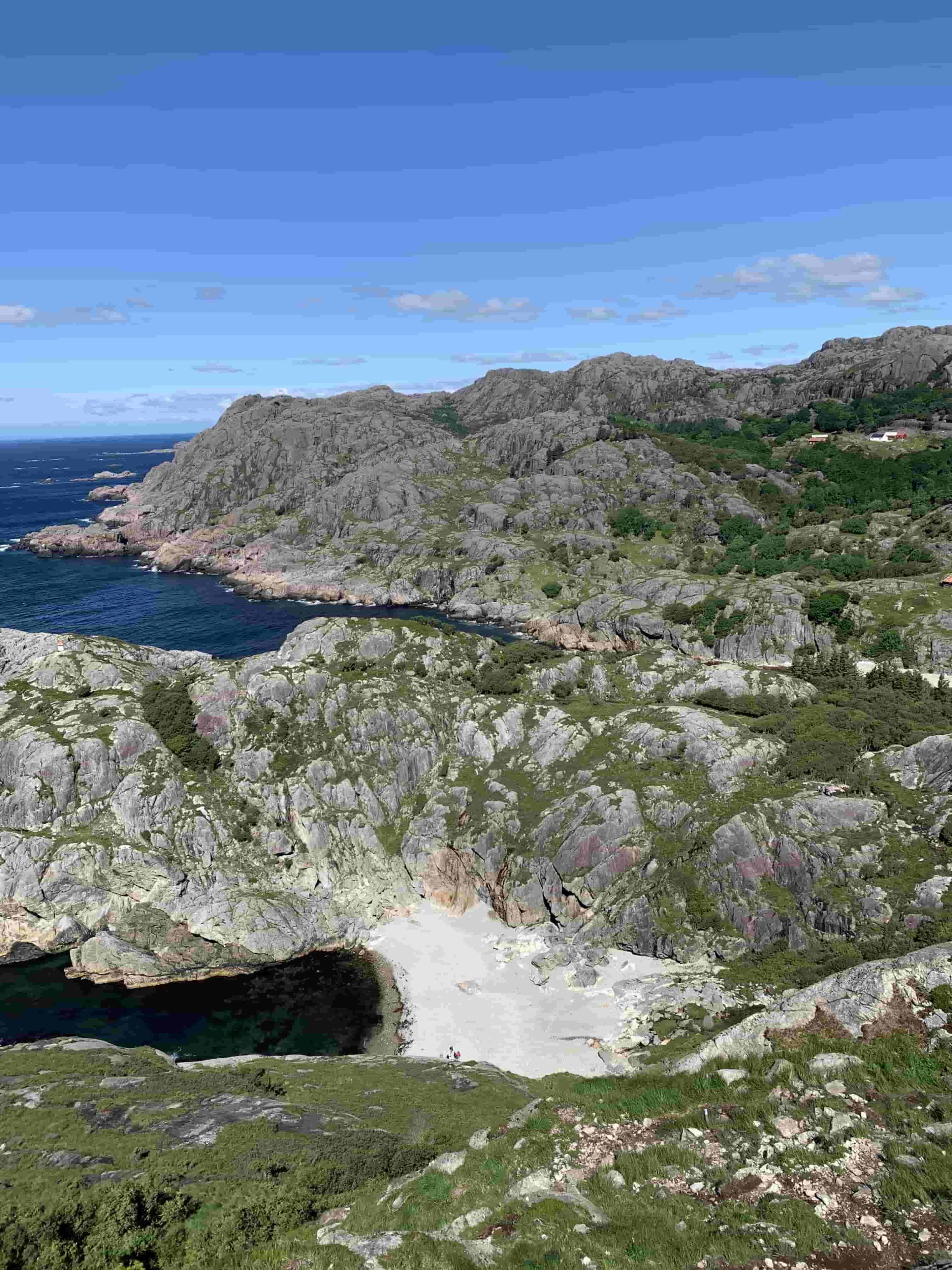 Na tym odcinku jest kilka tras i opcji. Nasza propozycja prowadzi najbardziej zewnętrznym szlakiem, czyli Brufjell do Brufjellhålane nad plażą Sandvika. Najpierw prowadzi przez las i pagórkowate polany, potem zaczyna się wspinać ku górze. Jak tam dotrzesz, warto byś zszedł na rajską plażę Sandvika. Lub podziwiał plażę otoczoną skałami ze szczytu Brufjell.
