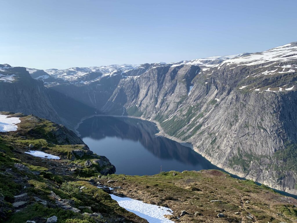 Czasem porośnięta mchem na głazach czasem górskim zboczem, z którego majaczy grafitowe jezioro. Wygląda jak fiord w pomniejszeniu i już wiesz dlaczego Trolltunga jest jedną z największych atrakcji Norwegii.