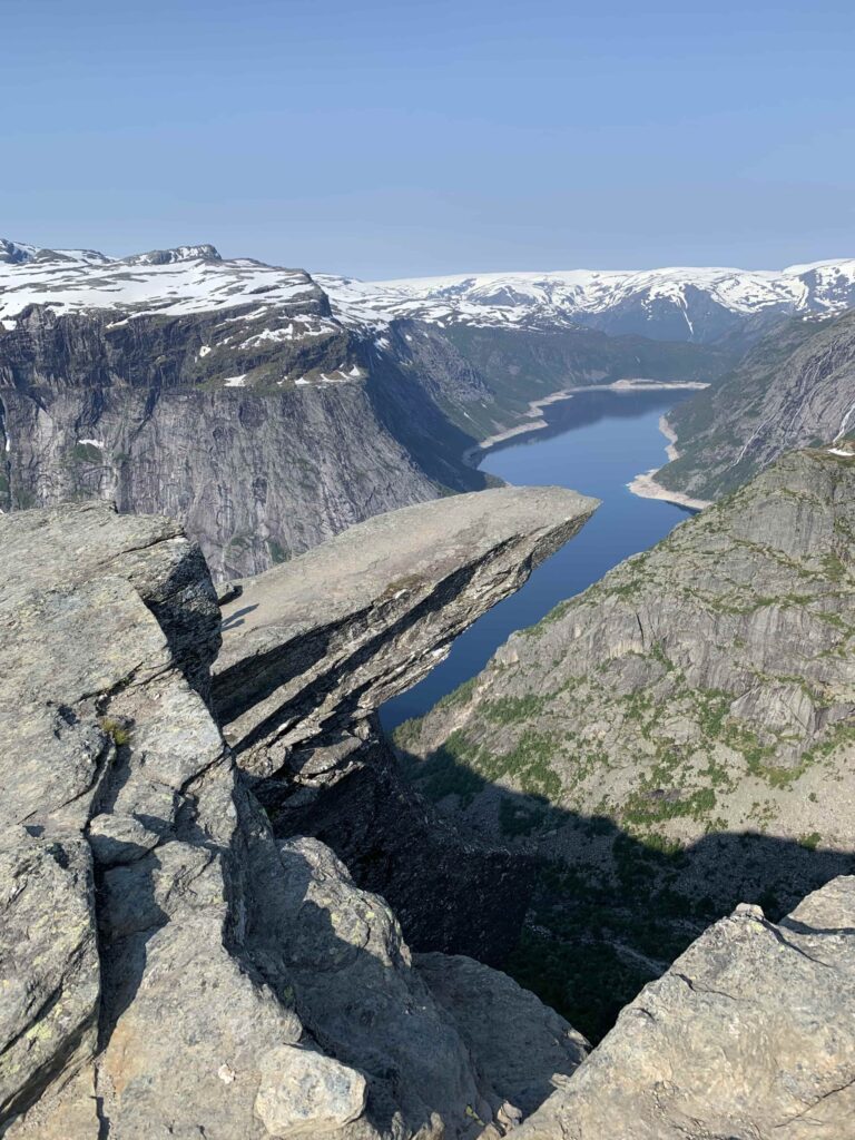 Nieco dalej ścieżka zwęża się i należy zwrócić szczególną uwagę na krawędź klifu i wysoki spadek. Nagle pojawia się Trolltunga! Ostatnie cztery żelazne stopnie które ułatwiają zejście na Trolltunga i jesteś u celu!