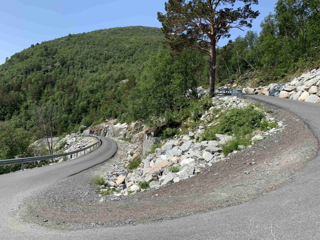 Pierwsze 800 metrów pięknej nowej drogi asfaltowej Måglivegen z 17. zakrętami i nachyleniem 17. stopni jest żmudne i monotonne, a schodząc w dół najbardziej obciąża kolana.