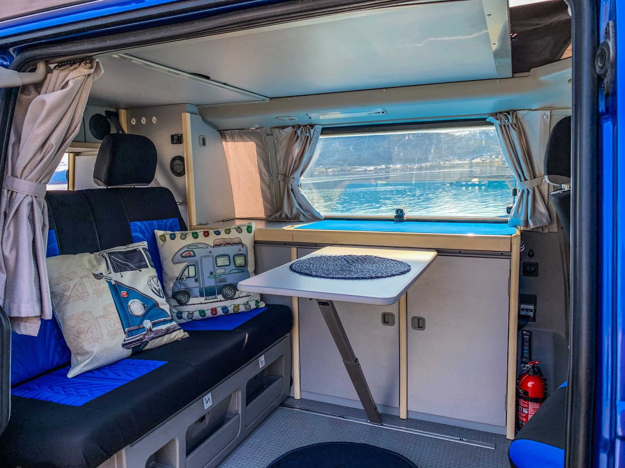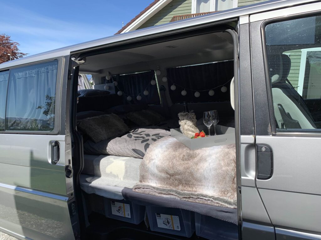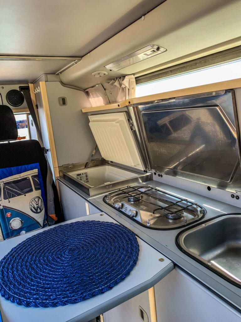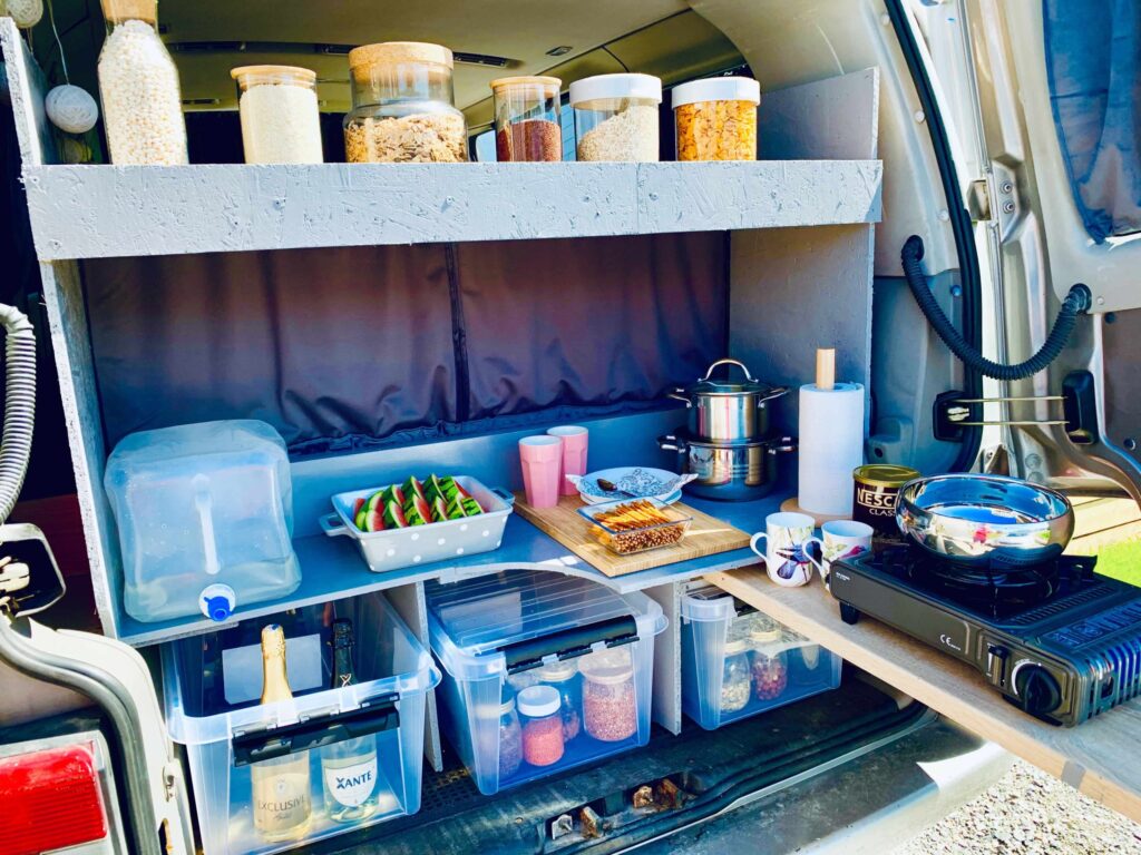 Z tyłu auta zbudowaliśmy kuchnię z wysuwanym blato- stołem, do gotowania kupiliśmy kuchenkę turystyczną, wrzuciliśmy zwykły grzejnik i….