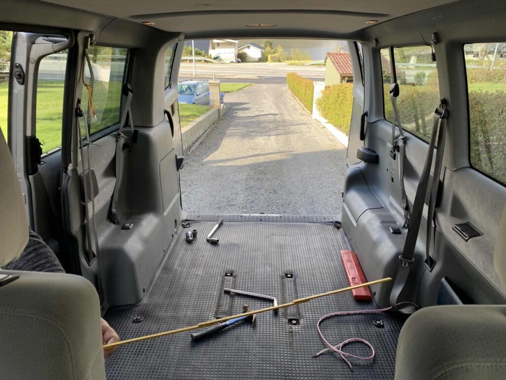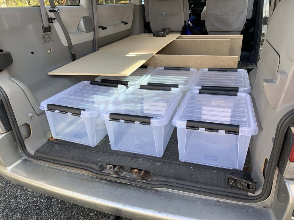 Wymontowaliśmy siedzenia. Zbudowaliśmy konstrukcję, na której położyliśmy materac z sypialni. W dużych plastikowych boksach trzymaliśmy ciuchy, buty, rzeczy toaletowe, garnki, talerze i wszystkie przydasie na podróż.