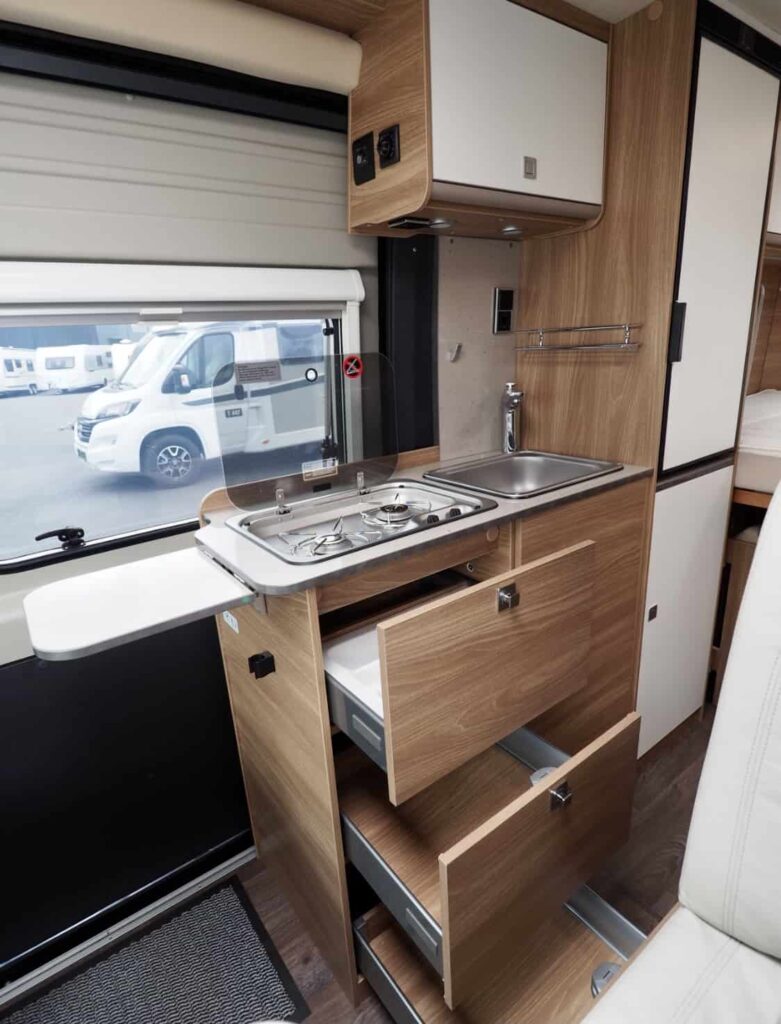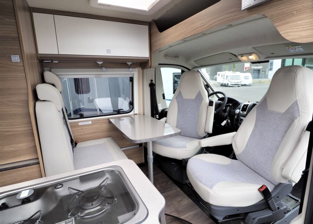 Dwa dwuosobowe miejsca do spania, gniazdo 230 v z funkcją ładowania akumulatorów, obrotowe fotele, rozkładany stół. Czyli luksusy wszelakie.